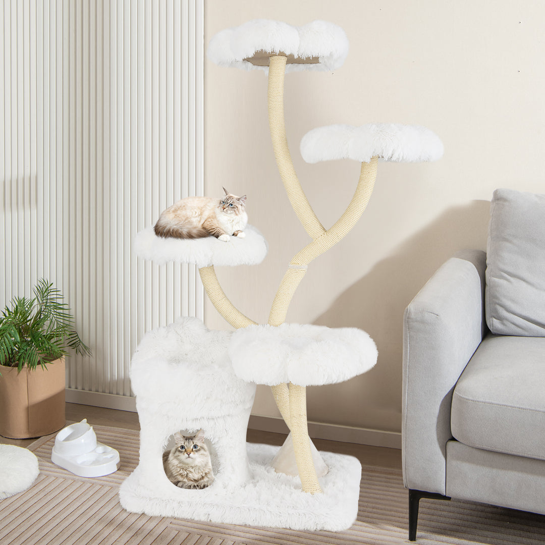 Freestanding Cat Tower with four Flower-shaped Platforms and Sisal Scratching Posts-White