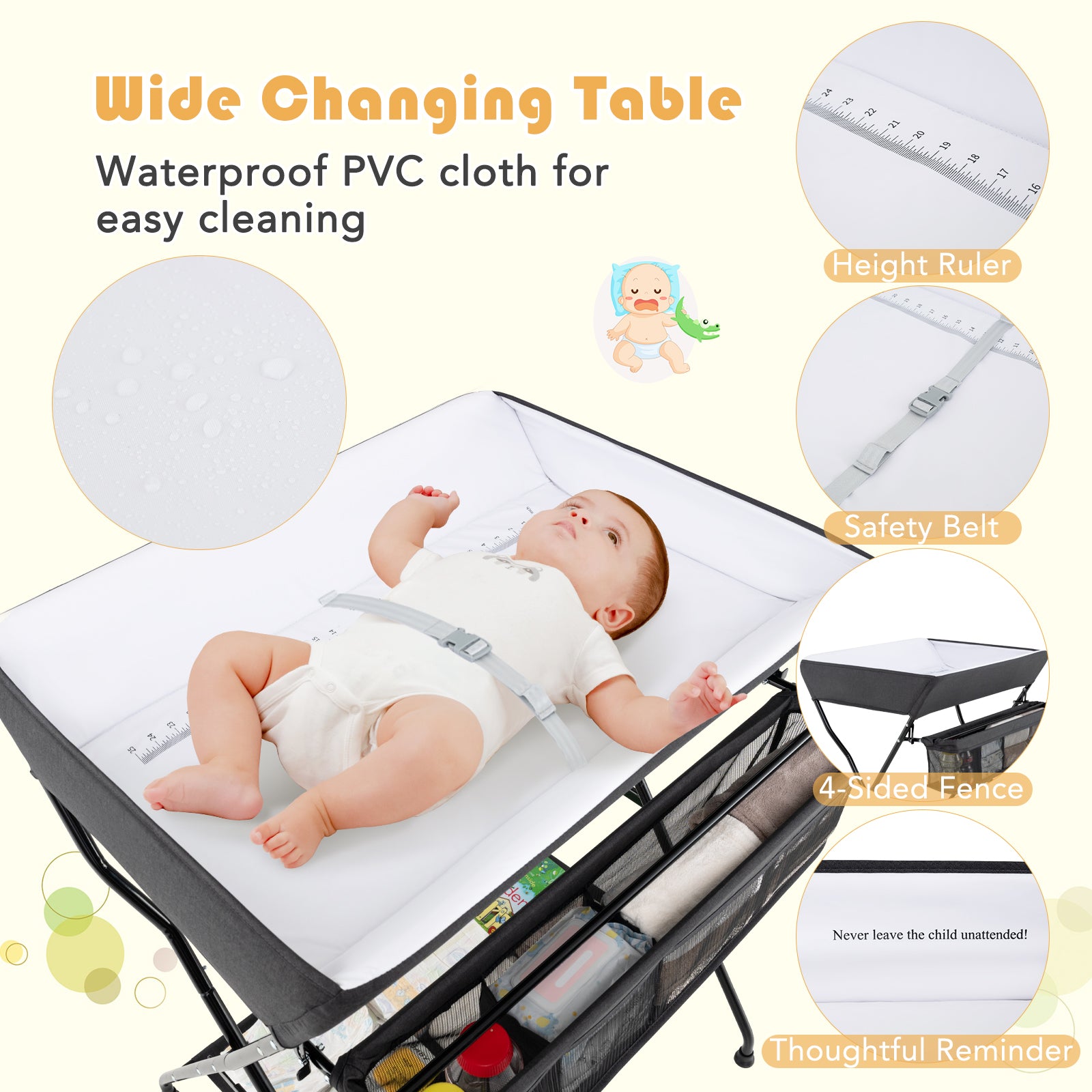 ● Can be used as a changing table massage table drying rack and more ● Heavy-duty steel tube structure ensures great stability and load capacity ● Waterproof and durable PVC fabric for easy maintenance ● Side basket and bottom shelf for easy access of diapers towels etc ● 4-sided fence and safety belt provide foolproof protection ● Height ruler design helps measure baby's height conveniently ● Anti-slip foot pads increase stability and protect the floor from scratches ● No more bending to change diapers or massage for babies ● Quick folding design for easy storage and carry ● Easy to assemble in a few steps