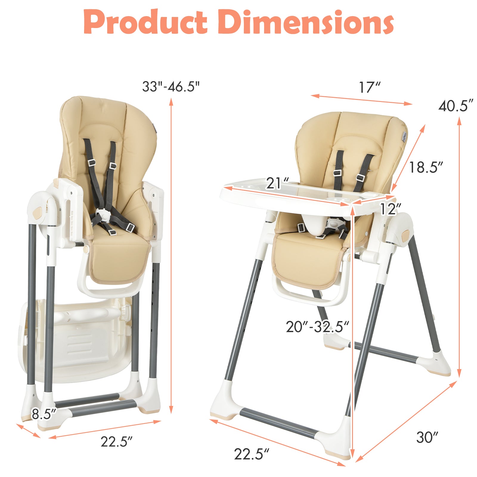 Give your baby his/her own space to eat with this foldable baby high chair!   This high chair comes with 4 reclining angles and 3-position footrest to keep your baby comfortable during meals or playing. 8 height positions are provided to match dining tables at different heights. And the tray position is adjustable to 3 positions so that you can give your child more room as they get older. With the stable triangular structure non-slip foot pads and 5-point safety harness the high chair ensures excellent security. The thick and soft padded seat cushion with easy-to-clean PU leather surface provides all the comfort your little one needs. Besides the back storage bag is convenient to store your baby's stuff and the book holder on the lower tray brings great convenience. When you're not using this chair it can be quickly folded up and placed in the corner or next to the cupboard which will not occupy much space.   If you are looking for a high chair like this do not hesitate to place an order!   Removable double trays with 3 adjustable positions for convenient use The humanized book holder on the tray is perfect for reading A-shaped and 4-point support structure ensure excellent stability The back mesh storage basket is handy to store baby's essentials Detachable and soft PU seat cushion is easy to clean with damp cloth 5-point harness belt keeps the baby safe in the chair without sliding down 8 adjustable heights to match tables at different heights 4-position adjustable backrest meets baby's different postures 3-positon adjustable footrest provides ultimate comfort Smooth edges and rounded corner design avoid potential injury Easy to fold up for compact storage and convenient transportation With ASTM certification to ensure high safety Suitable for children aged 6-36 months