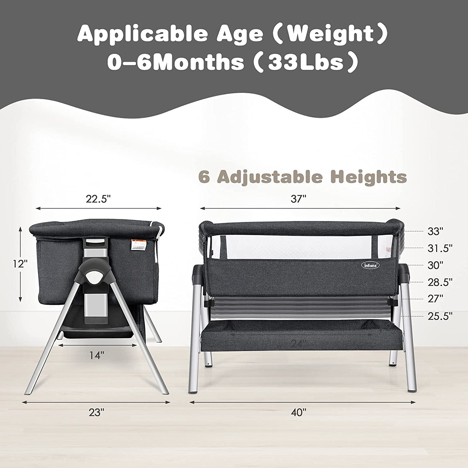 The baby bedside cradle makes your baby sleep more peacefully and sweetly!   Featuring aluminum tubes and linen cloth this baby bassinet is sturdy and durable and can stand the test of time. Besides the cotton mattress cover is more skin-friendly allowing the baby to sleep more comfortably. In addition the height and angle of the sleeping basket can be adjusted to facilitate your interaction with your baby and at the same time can effectively prevent the risk of spitting up milk. The included travel bag is convenient for you to put baby bassinet in it and you can travel with your baby and the baby bassinet. More importantly this baby bedside cradle has obtained ASTM and CPSC certification so you can rest assured that your baby can use it.   This baby bedside sleeping basket will never disappoint you so hurry up and buy it!   Removable fabric design for easy cleaning Large capacity basket convenient for your life Angle adjustable effectively prevent the baby from spilling milk Adjustable height design the crib is suitable for most adult beds Cotton mattress covers and 300D linen bassinet fabric are soft and skin-friendly The protective spine support at the bottom of the sleeping basket protects the baby's spine The built-in wheels are easy to move and the bedside crib can be detachable suitable for multiple scenarios
