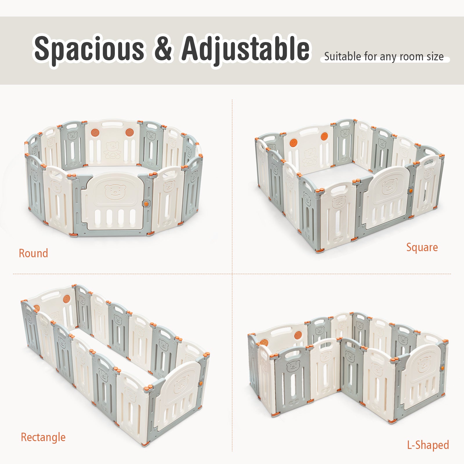 ● Large coverage space for kid to playing and walking ● 14-panel playpen for adjustable shape and sufficient space● External door lock to prevent kids from getting out of the fence● Non-toxic HDPE material to benefit baby's health● Fix knobs non-slip bases and suction cups for high stability and sturdiness● Foldable design for easy storage and carrying ● Game board to promote kid's brain development● Bright color and lovely pattern to attract kid's attention● 23.5" reasonable height to assist your baby to learn to stand and walk● Develop baby's hand-eye coordination ability ● ASTM and CPSIA certification to ensure high security