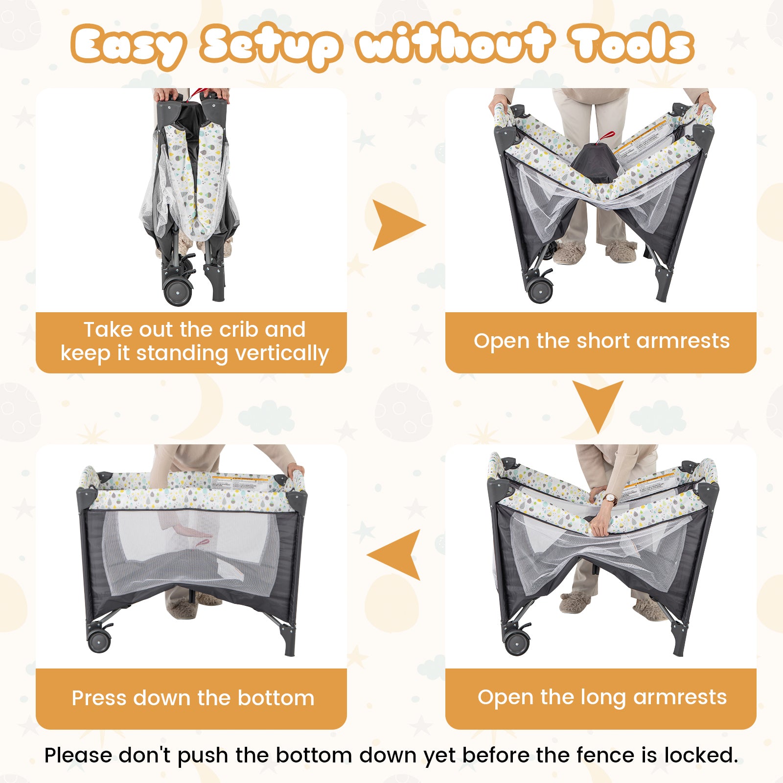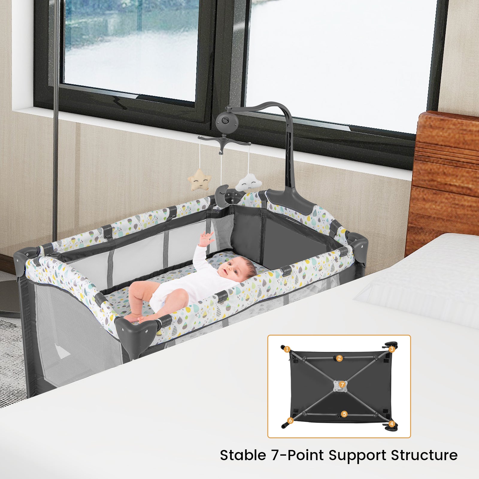 ● 3-in-1 design: baby bassinet changing table and baby playpen● Detachable changing table makes diaper changing a breeze ● 4-sided breathable mesh for better ventilation and visibility● Music box and 3 hanging toys add fun and improve development● Soft mattress offers a cozy space for the baby to sleep● Side storage bag keeps baby’s essentials well organized● Heavy-duty metal frame with 7-point support structure ● Easy to store and transport with the included carry bag● 2 wheels with brakes allows for easy movement● Tool-free setup saves your time and energy● Complies with ASTM & CPSIA standards