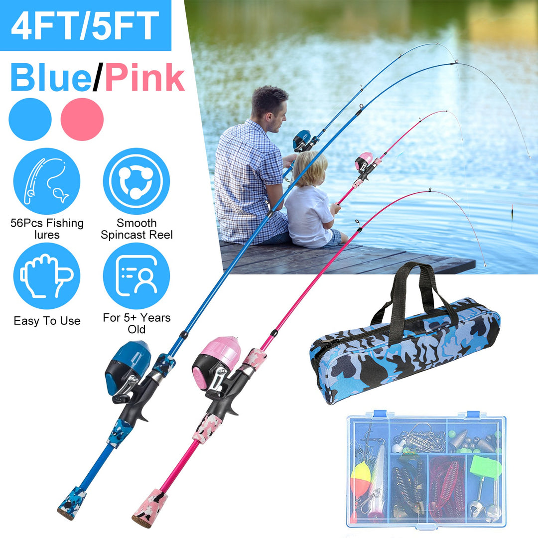The Kids Fishing Pole Set is the perfect starter kit for young anglers, designed for children aged 5 and up. It includes a telescopic fishing pole, spincast reel, a backup fishing line, and a tackle box filled with 56 fishing lures to suit various fishing conditions. Available in blue and pink, this fishing set is ideal for both boys and girls, offering a fun and safe way for kids to explore fishing.