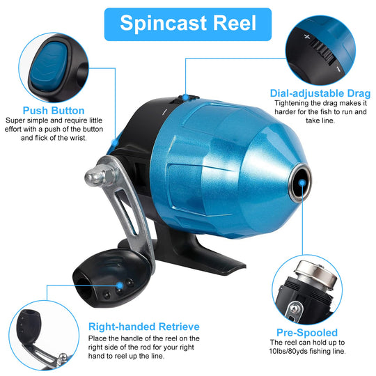 • Smooth Spincast Reel: Features a 3.0:1 gear ratio for smooth retrieval, with a dial-adjustable drag to stop the handle from moving backward and secure a solid hookset.