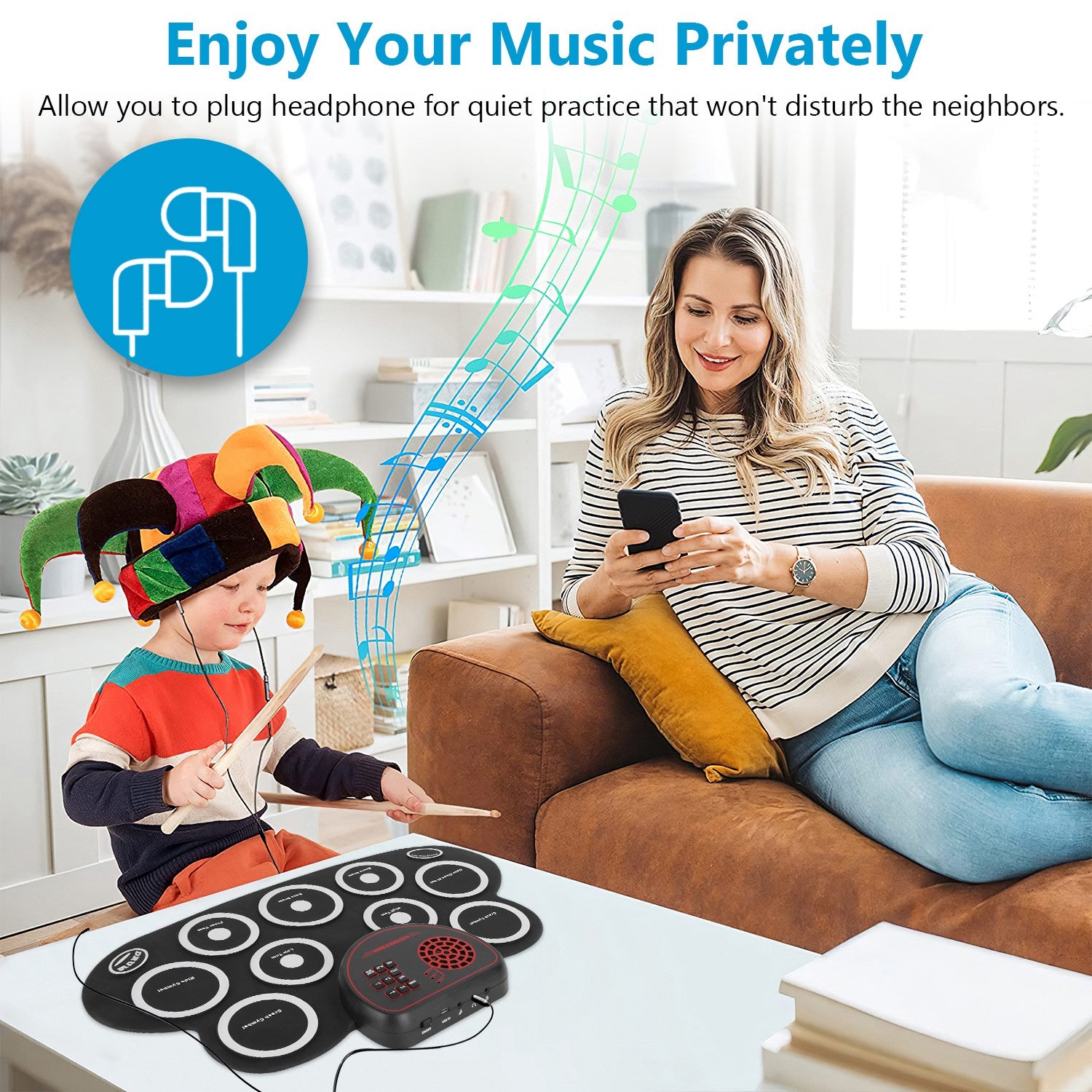 10 Pads Electric Drum Set Foldable 10-Drum Silicon Drum Kit Foldable Electronic Drum Pad Machine with Drum Sticks Headphone Jack Speaker Battery Dual-