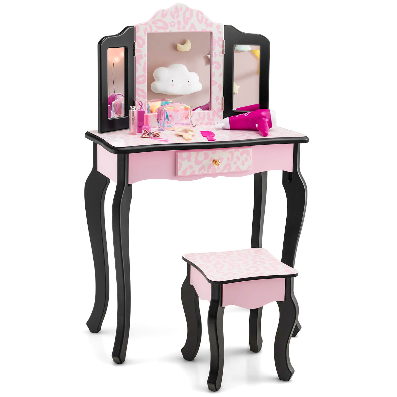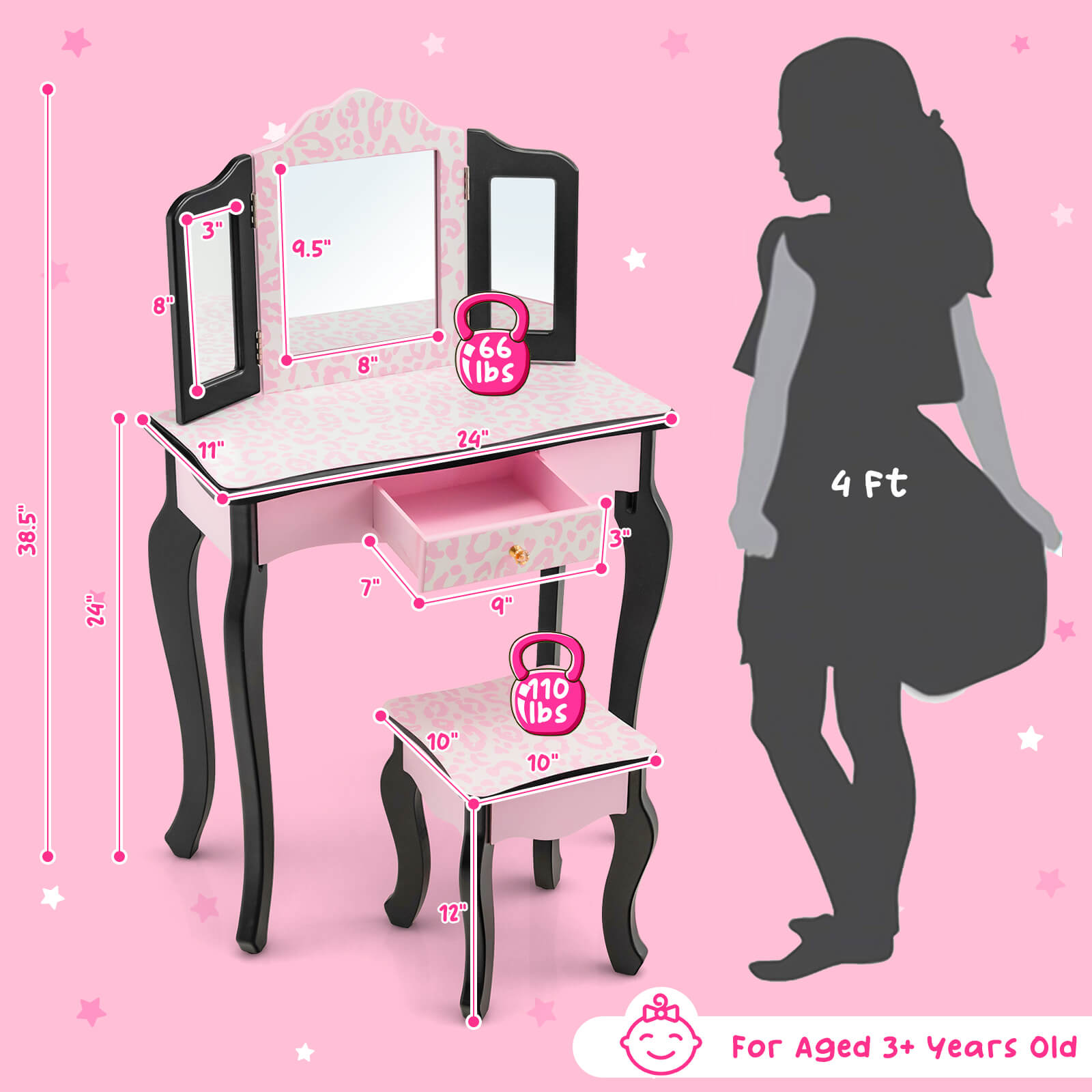 Are you still looking for a cute gift for your child? If so this vanity table and stool set is the perfect choice for you!   This pretend play vanity set comes with a tri-folding mirror and a matching stool to offer kids a convenient and enjoyable makeup and dressing-up experience. More importantly the dressing table can be used as a writing desk after removing the mirror which can meet various needs for both entertainment and study. Made of selected MDF material and supported by 4 curved legs this vanity set is super stable and durable. Besides the bottom anti-slip foot pads enhance overall stability and also protect the floor from scratching. The burr-free edges round corners and anti-toppling device ensure high safety. What's more this pink and black vanity set decorated with leopard print will be an appealing addition to your child's bedroom or play area bringing great fun for kids.   If you are looking for a vanity table and stool set like this do not hesitate to place an order!   The dressing table can be used as a writing desk with the mirror removed Cute vanity set with leopard print and suitable size for children Sturdy MDF construction is not easy to deform and supports long-term use A large storage drawer for makeup supplies toys and other items Tri-folding mirror with high definition provides a wider view for makeup Rounded corners and smooth edges to avoid bumps and bruise Anti-toppling device to fix the table to the wall for higher stability Anti-slip foot pads prevent the floor from scratches and enhance stability Drawer with an exquisite crystal knob for easy pulling out A perfect birthday or holiday gift for kids Easy to assemble and clean