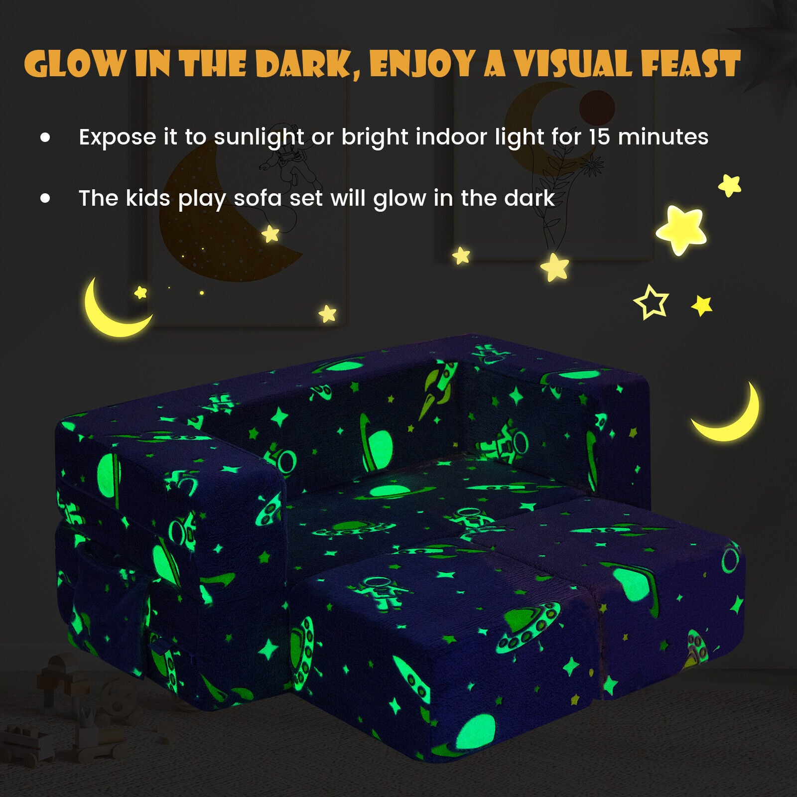 ● Various combinations and layouts for endless fun● Glow in the dark for a profound visual enjoyment● Oeko-Tex certified and skin-friendly velvet fabric for security and comfort● High-resilience sponge with CertiPur-US certification for coziness and safety● Removable and machine washable covers for easy maintenance● Kids couch with 2 ottomans for more support to the body and leg relaxation● Ergonomic backrest and armrest protect spines and support arms● Safe round edges to protect babies' delicate skin● ASTM and PSIA certifications for added reliability● Suitable for kids above 3 years old to promote imagination creativity and motor skills● Full assembly and quick rebound for worry-free use