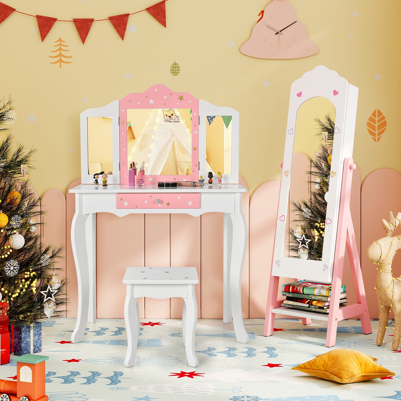 Kids Jewelry Organizer with Full Length Mirror Drawers and Storage Shelves-White