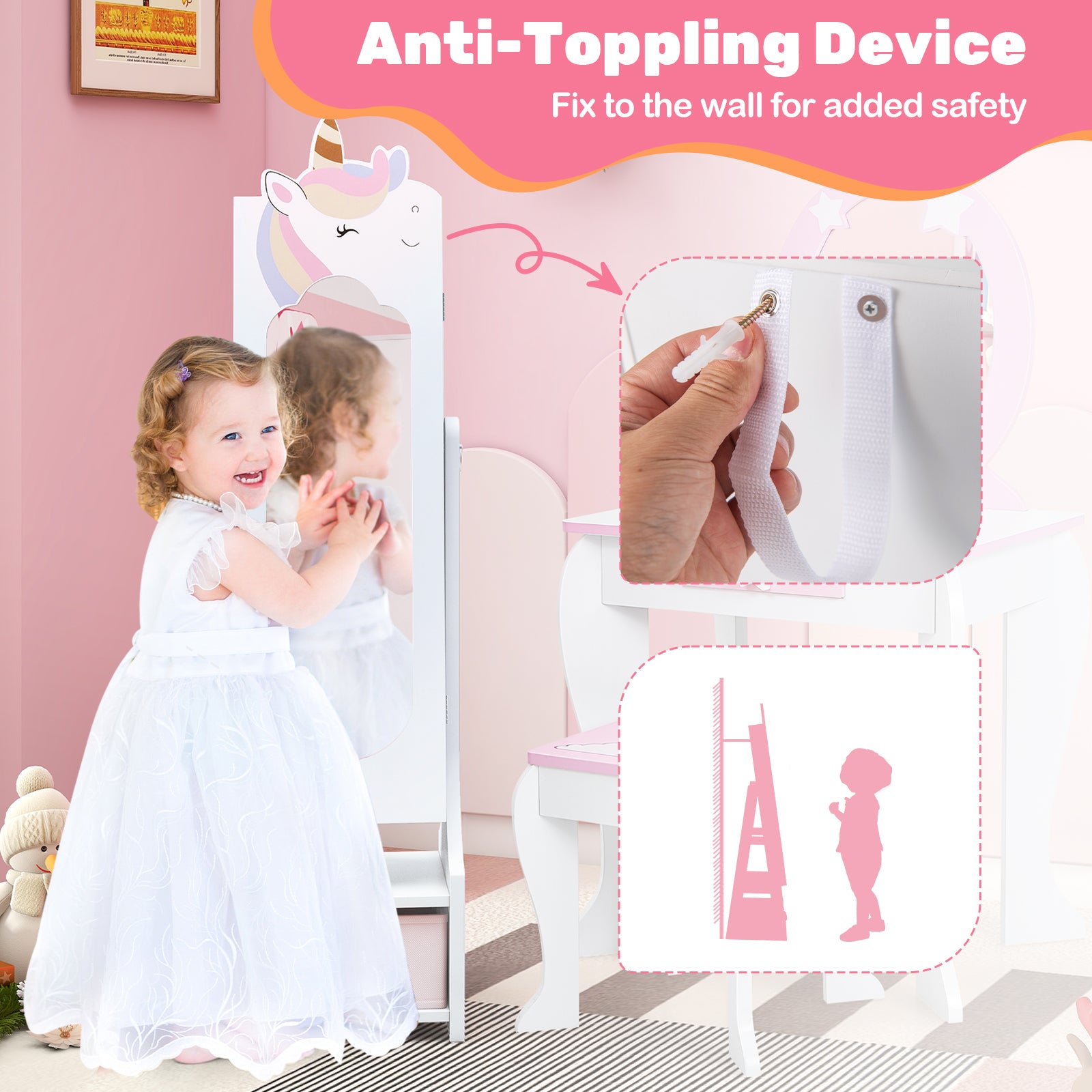 ● Combines a full-length mirror and jewelry cabinet in one● Equipped with lots of storage compartments● Uses high-definition silver mirror to provide distinct view● 2 adjustable tilt angles for perfect viewing● Constructed with a stable triangular structure● Can be fixed to the wall with included anti-toppling device● Keeps the door securely closed with the magnetic catch● Perfect gift for your little one● Complies with ASTM and CPSIA