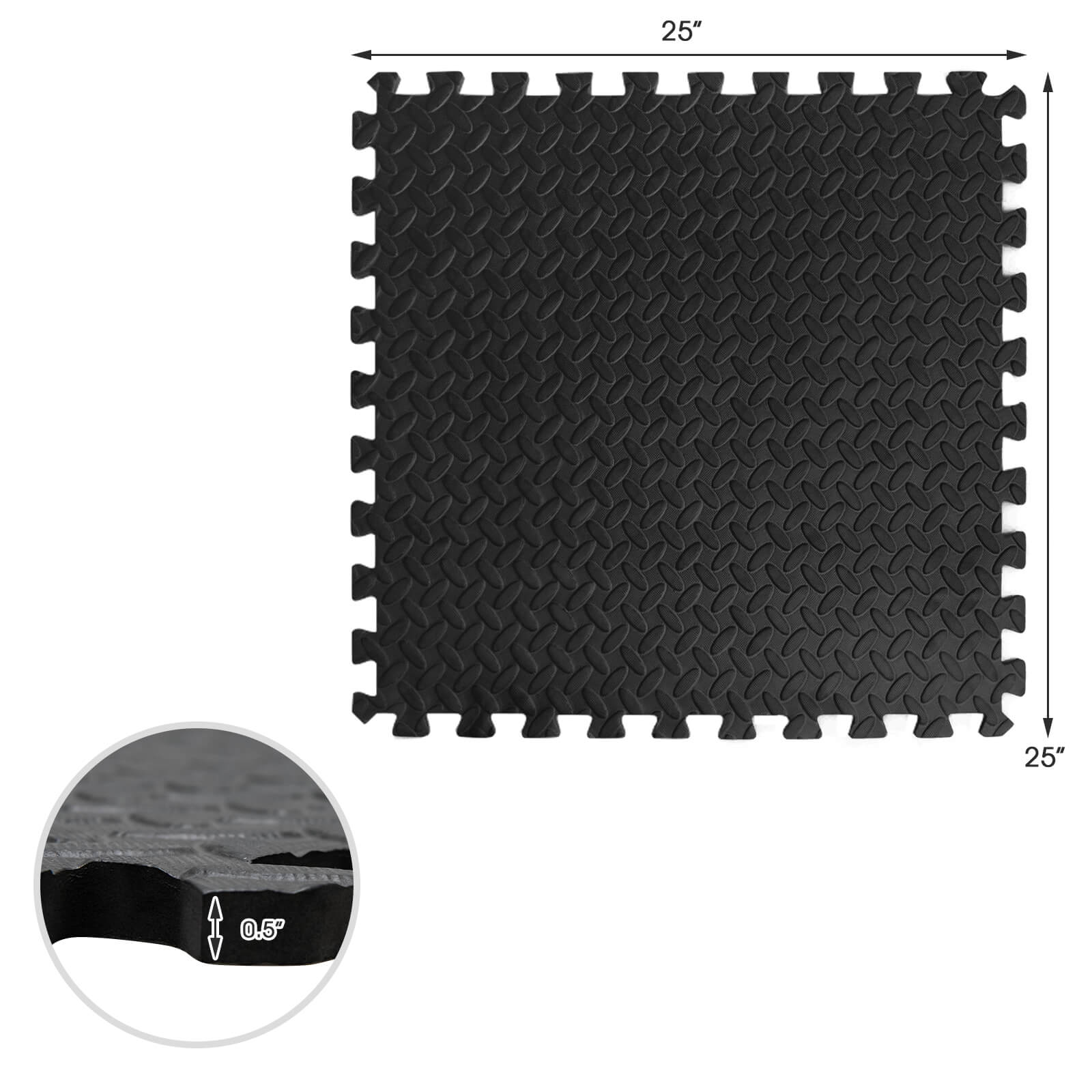 ● 8.5'(L) x 6.4'(W) large floor mat covers large area suitable for workout● Seamless connection non-slip surface and 0.5" thickness ensure your using safety● Great for floor protection noise reduction heat preservation and shock absorption● Ideal for pet area gym play room or living room● Premium EVA foam for high durability● Easy to clean with a cloth● Light weight of each tile for easy moving and storage● 12 tiles and 24 borders for free combination