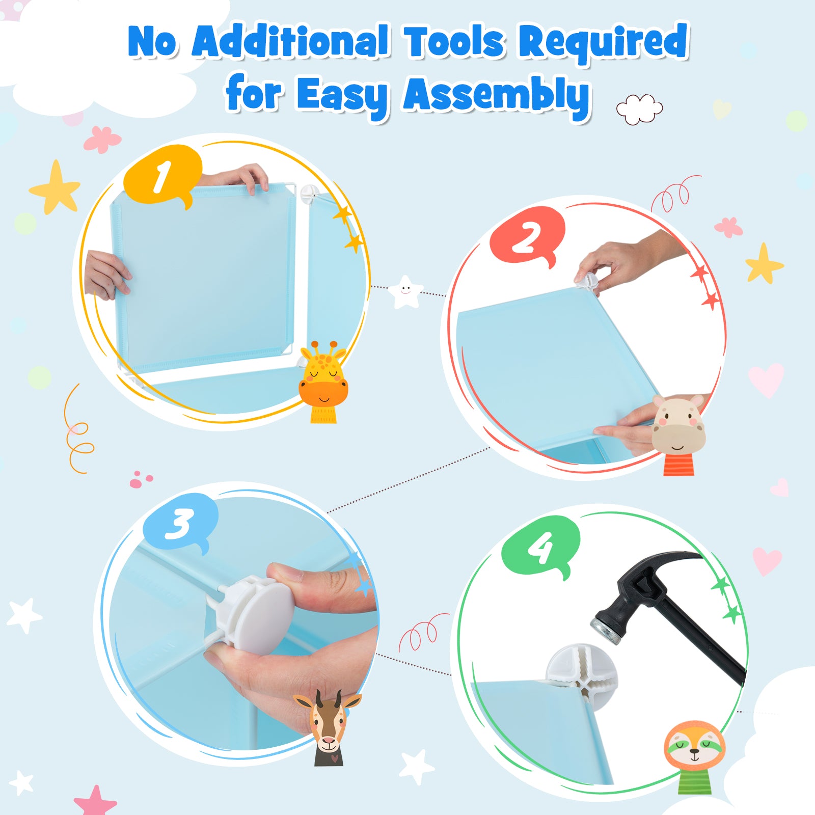 ● 12 storage cubes meet daily storage needs● Flexible combination of cubes fits various scenarios● Free arrangement of hanging pole allows versatile use● A mallet is provided and no other tools are needed● Durable & lightweight PP material provides a long service life● Carton pattern on the doors makes it an adorable addition to kid's room● Easy cleaning PP panels save you time and effortInstallation guide