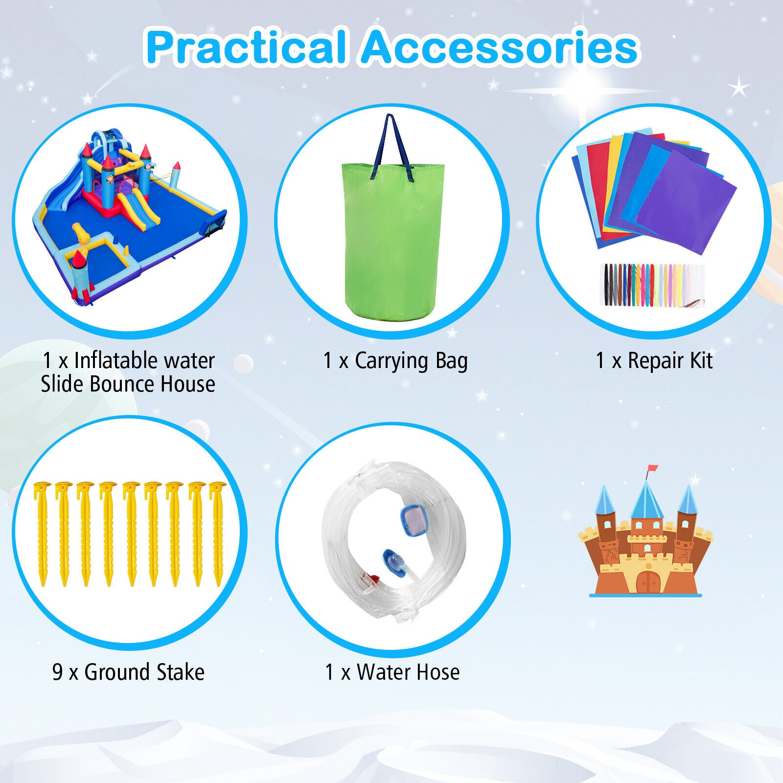 ● Rocket theme design makes the bouncer more attractive ● Surfing the long and short slide entertain kids a lot ● Kids can jump climb shoot play soccer volleyball and ring toss in various areas ● Splash pool with water gun for endless water fun in summer ● Wet or dry use for all year round fun ● Durable oxford cloth with fine sewing for longer lifespan ● Mesh protective wall and enhanced handrails for added safety ● Easy to set up and take down in minutes ● Convenient to store the deflated bouncer with carrying bag ● Ground stakes secure the bounce house to the lawn firmly ● Perfect for yard birthday party lawn amusement park etc