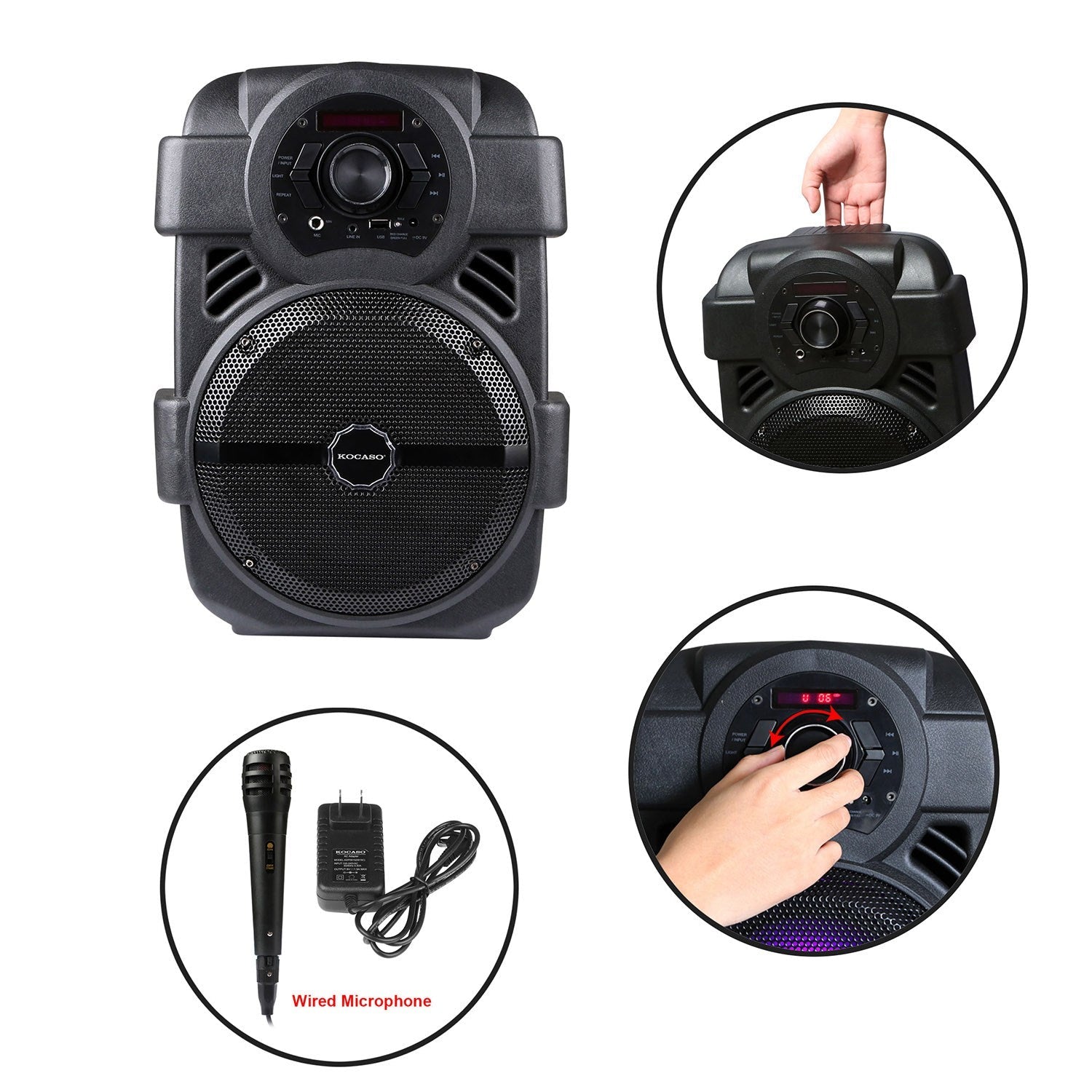 KOCASO Wireless Speaker Portable PA Karaoke System with 8" Subwoofer Sound System Wired Microphone w/ DJ Lights FM Remote Control