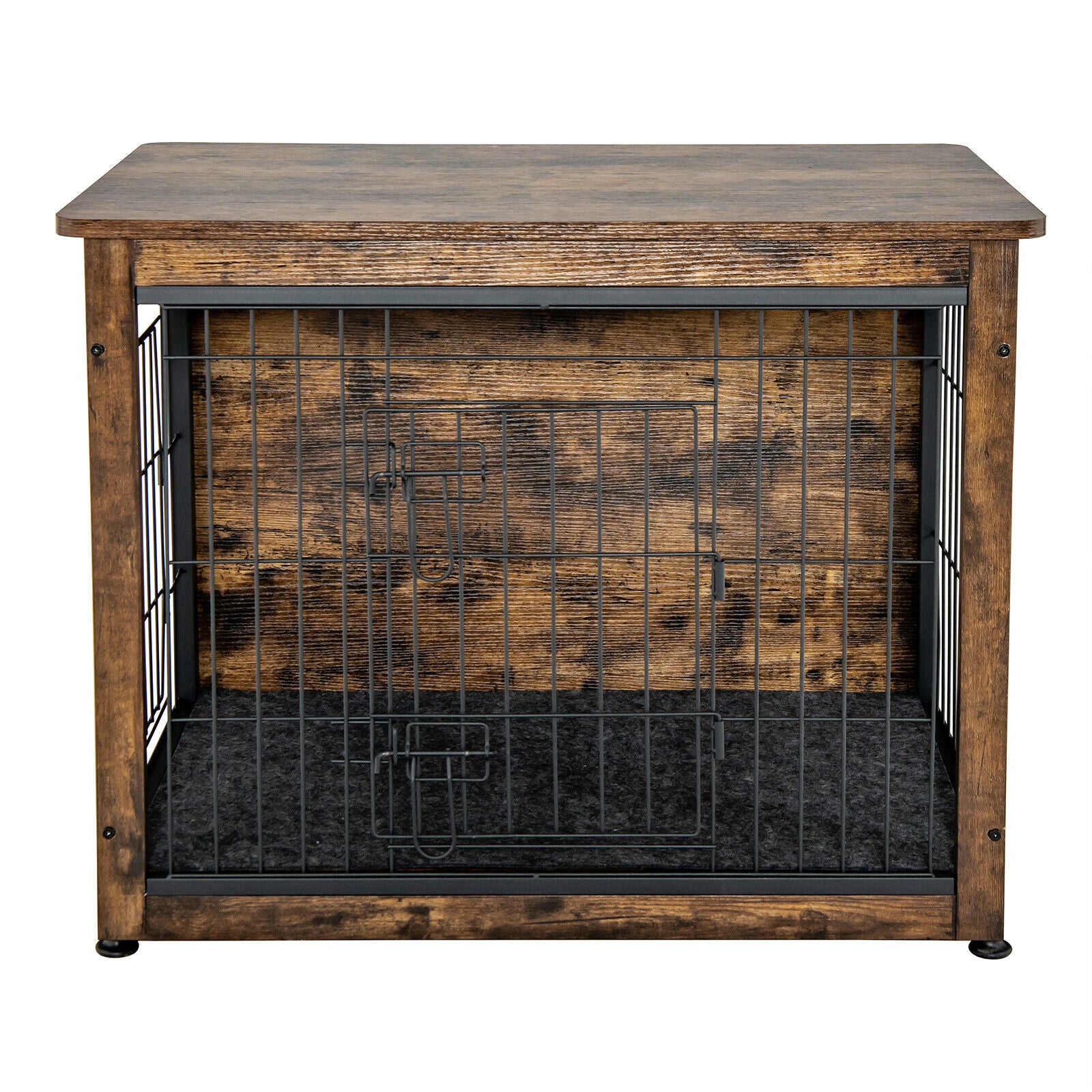 This wooden dog crate has a spacious table top which allows it to be used as a side table for different needs.   Besides the base is equipped with a felt pad to provide a comfortable space for dogs to move and rest. And the three-sided ventilated wire mesh is strong durable chew-resistant and relatively harmless and safe for dogs. What's more the dog crate has two doors and the side door can be installed on the left or right side as needed providing you with more flexibility. Featuring with rustic and realistic wood grain surface our dog cage is easy to clean and very beautiful thus it is a perfect furniture in home. In addition the functional pet crate is safe for pets with protective curve edges and adjustable pads. Constructed of engineered wood and metal structure the crate can ensure a higher weight capacity of 110 lbs!   If you are looking for a wooden dog crate like this do not hesitate to place an order!   Versatile design makes it also a perfect side table nightstand Featuring a dirt-resistant felt pad to improve inner environment Hinged doors with 2 L-shape latches ensure higher safety Large tabletop can accommodate multiple daily items Sturdy steel mesh is chew-resistant and stable Reversible side door is free to adjust on the left or right side Equipped with 4 adjustable pads to adapt to uneven grounds Rustic design can complement with any home decor Easy to clean with smooth and waterproof surface