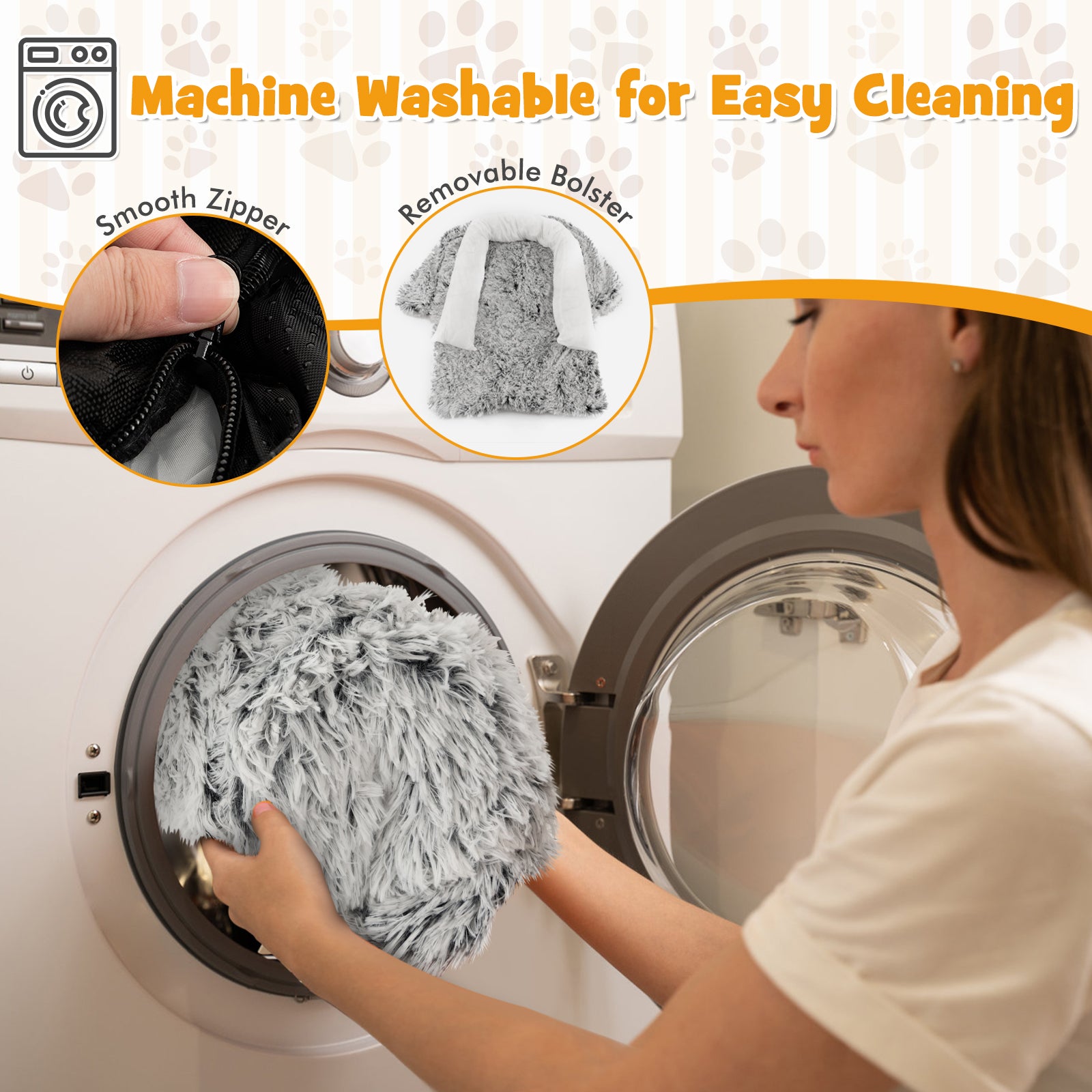 ● Designed to protect your furniture from pet hair scratches and dirt● Can be used on the bed sofa floor or in the car ensuring your furniture stays clean● The long plush fabric provides a soft and luxurious surface for your pet to relax on● The padded pillow with soft cotton filling provides additional neck and head support● Thanks to the convenient zipper and a removable bolster the cover is easy to clean● The reliable waterproof furniture cover adapts to more environments● The anti-skid bottom provides stability and prevents the bed from sliding● The carrying handle brings convenience for moving the dog bed anywhere you want● The handle can also be tucked into the gaps of your sofa ensuring it stays in place