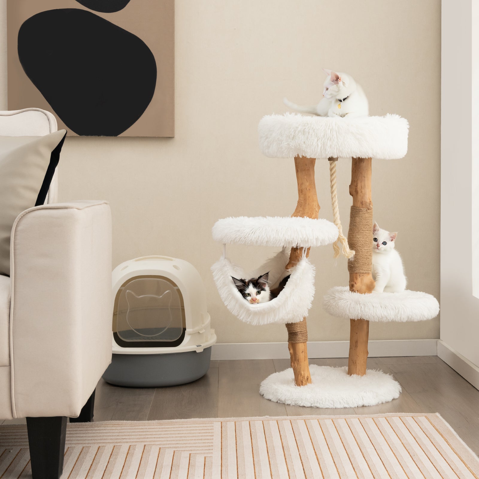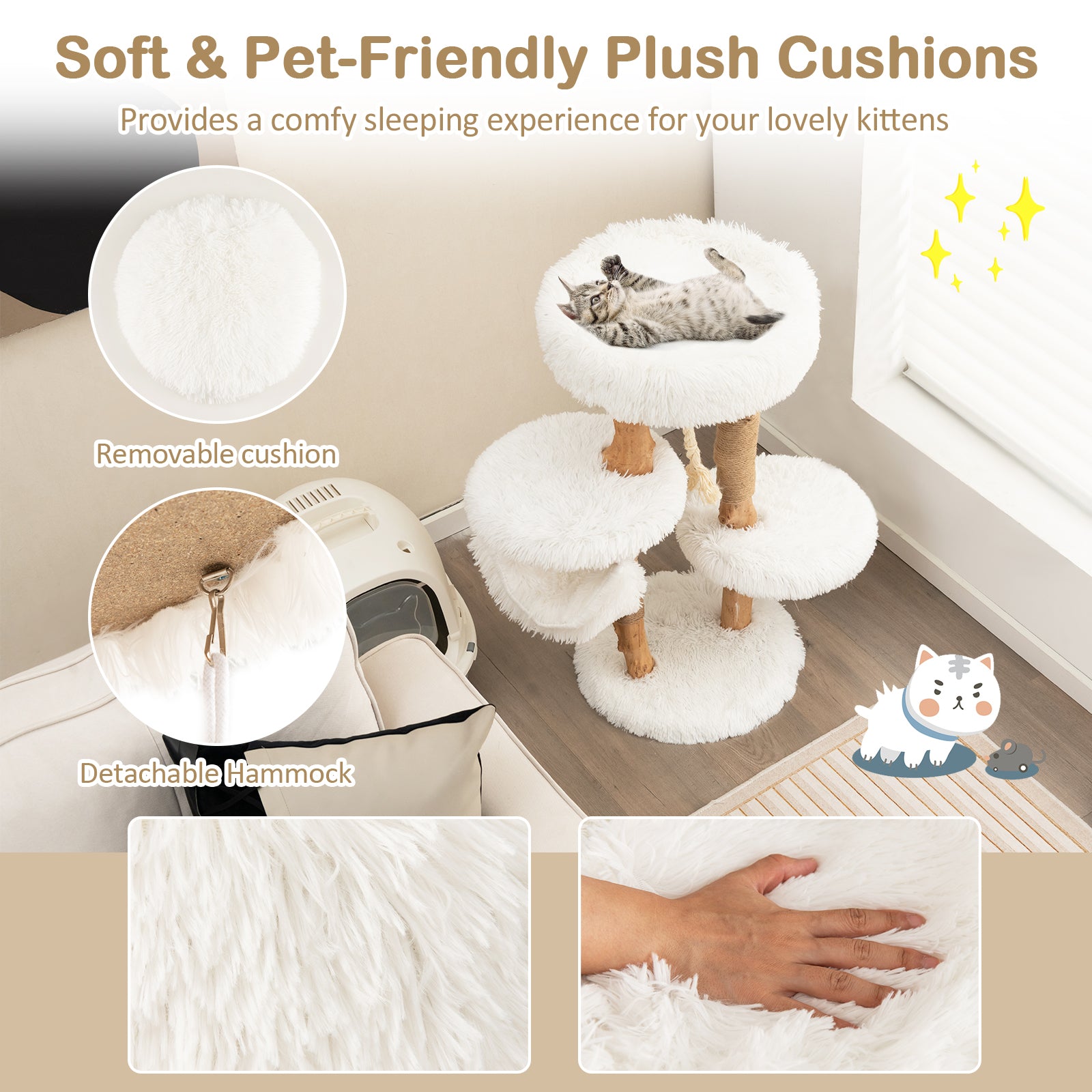 ● The solid wood posts provide excellent durability and sturdiness● Each supporting tree trunk is unique thus the shape of the cat tree may differ slightly from pictures● The top perch with a thickened cushion provides a comfortable napping experience● The warm hammock provides a comfy and secure resting spot● The jute scratching posts allow kittens to release the scratching urge● The posts are covered by soft jute ropes safe durable and pet-friendly● The hanging rope provides endless fun and exercise opportunities● The removable cushion and detachable hammock make it easy to clean● With its thick columns and wide base the cat tree ensures a stable structure● The simple structure and clear instructions allow for easy assembly