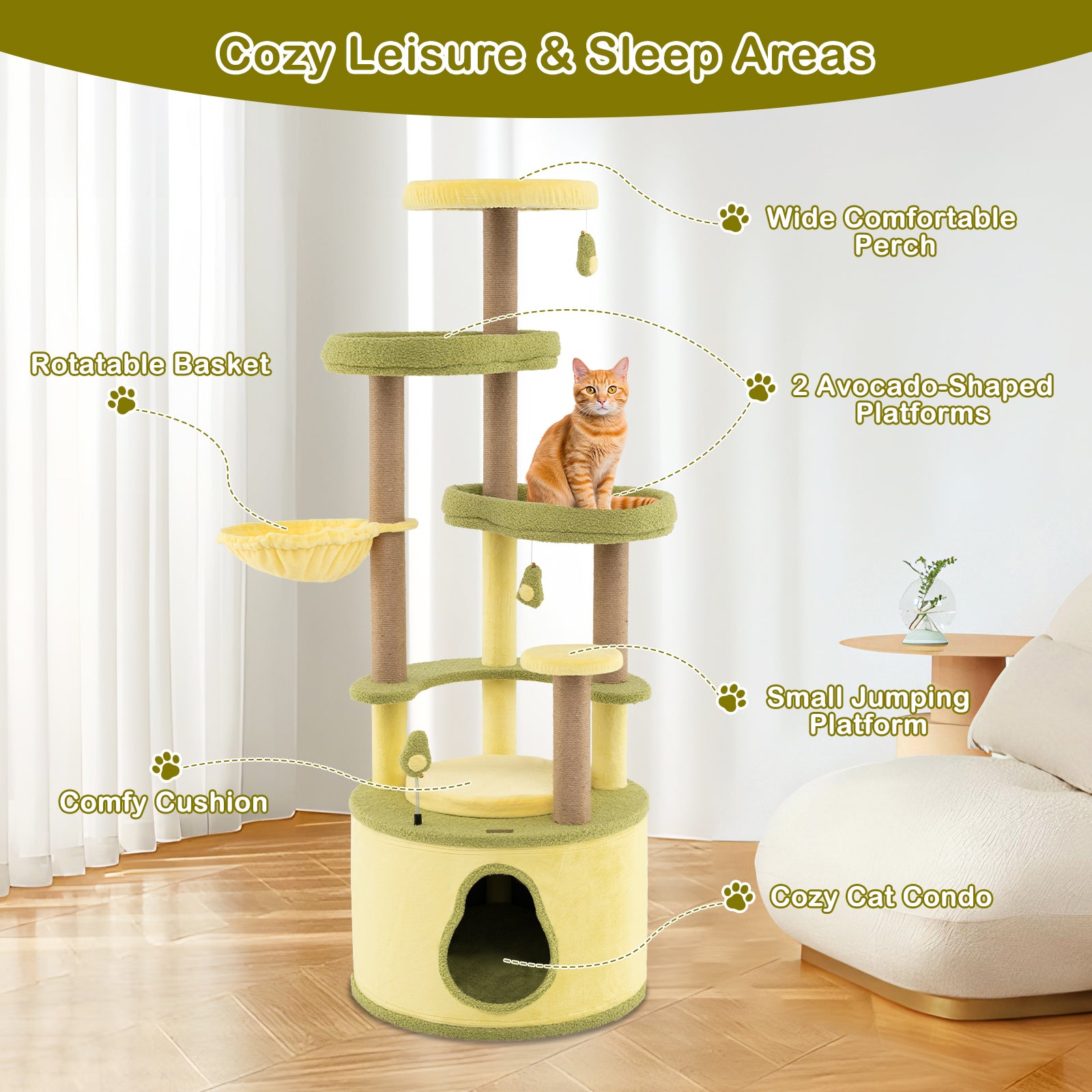 ● Premium jute scratching posts for claw sharpening and release cat scratching instinct● Joyful pompoms with bells and spring toy for interactive play● Rotatable basket offer extra comfort and flexibility● 2 avocado-shaped platforms for comfy lounging and sleeping● Wide comfortable perch for cats to observe surroundings● Detachable soft cushion for added coziness● 2 in 1 base with hook and loop fastener for customization● Sturdy frame with wide round base for stability● Soft faux rabbit fur and teddy fleece for skin-friendly touch