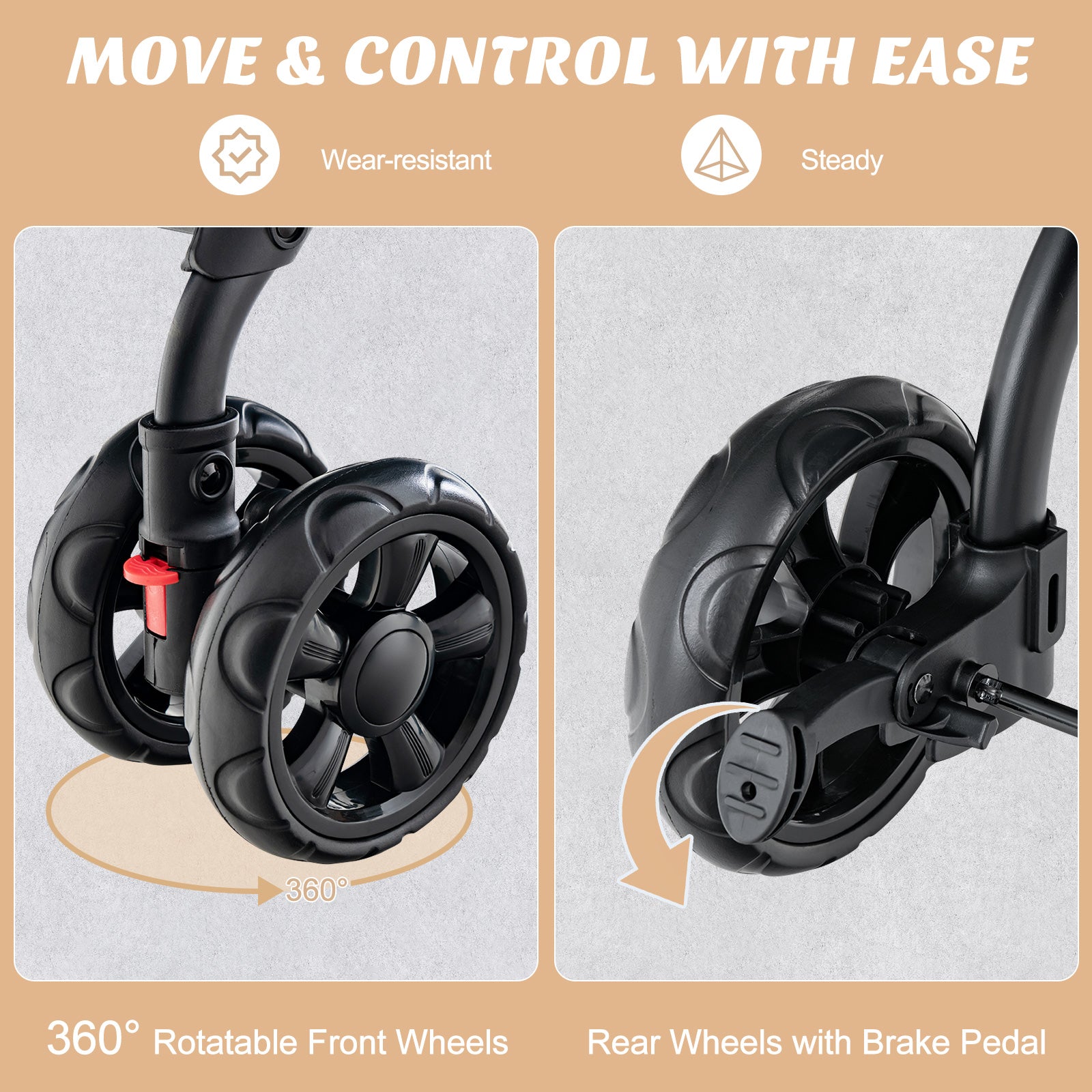 ● Versatile design meets your needs as a pet stroller car seat and pet carrier● Can serve with a pet carrier with convenient carry strap● 600D oxford fabric is breathable and waterproof● Powder-coated frame is sturdy and rustproof● 360° rotatable front wheels enable you to move and control with ease● Rear wheels with brake pedal ensure steady rolling● Detachable and washable cover is easy to maintain● Breathable mesh promotes air ventilation● Paddle handle provides comfortable and firm grip● 2 side pockets keep small essentials within easy reach● Safety belt prevents pets from escaping during traveling● Removable bed will avoid urine penetrate to the carrier● Detachable carriers are fixed by hook and loop fasteners ● Lightweight and foldable design make it easy to transport and store