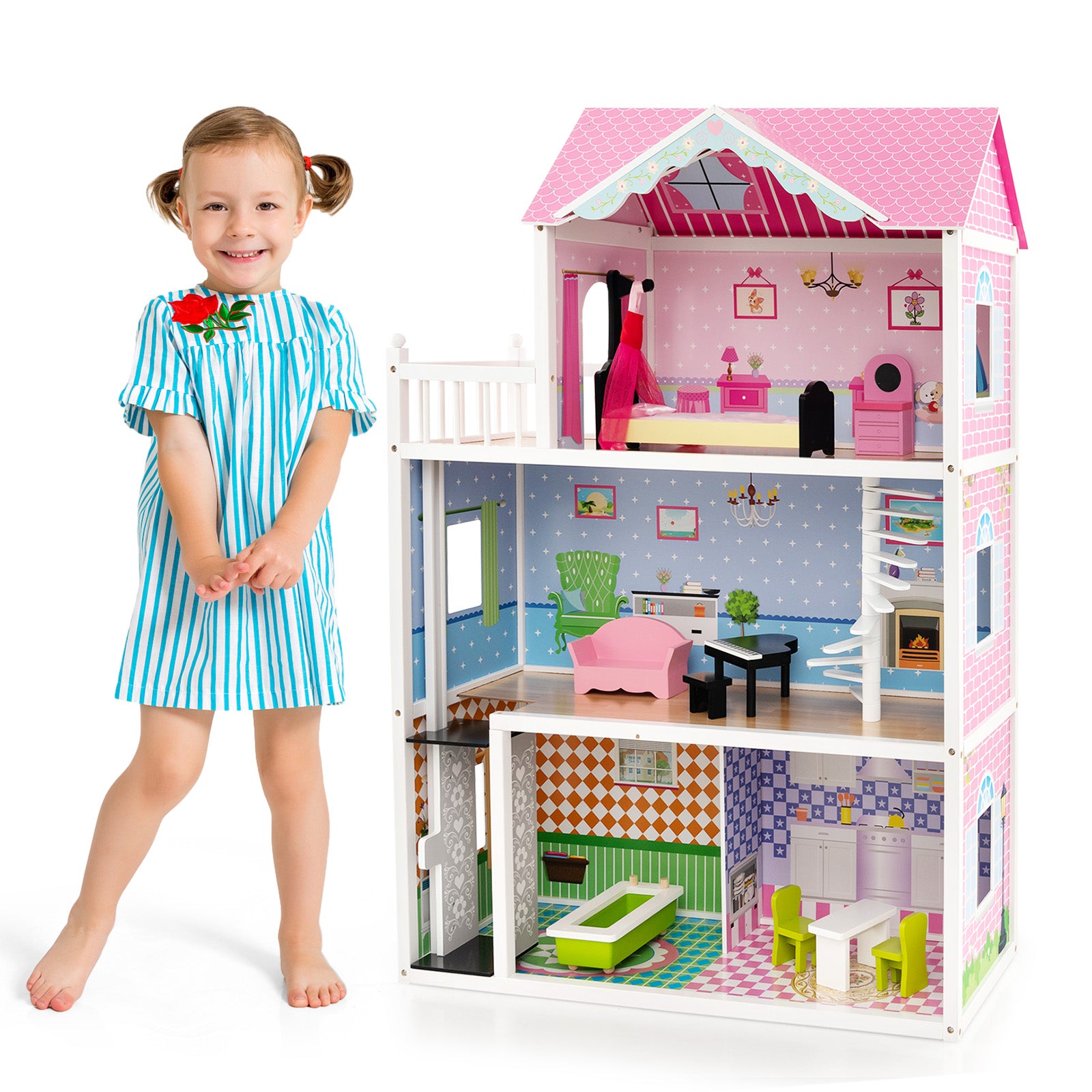 ● 5 simulated rooms for real experience ● Comes with 10 mini furniture accessories including 1 dressing table 1 bathtub 1 sofa couch 1 bed 1 bed canopy 1 piano & piano stool as well as 1 dining table and 2 dining chairs ● Semi-open design for easy reach for toys or simulated furniture ● Spacious enough to hold 10 inches dolls ● High-quality solid wood material without burrs for high durability and security ● Perfect gift for kids over 3 years old ● Great for imagination hands-on ability creativity and parent-child interaction. ● ASTM and CPSIA certifications for safe use