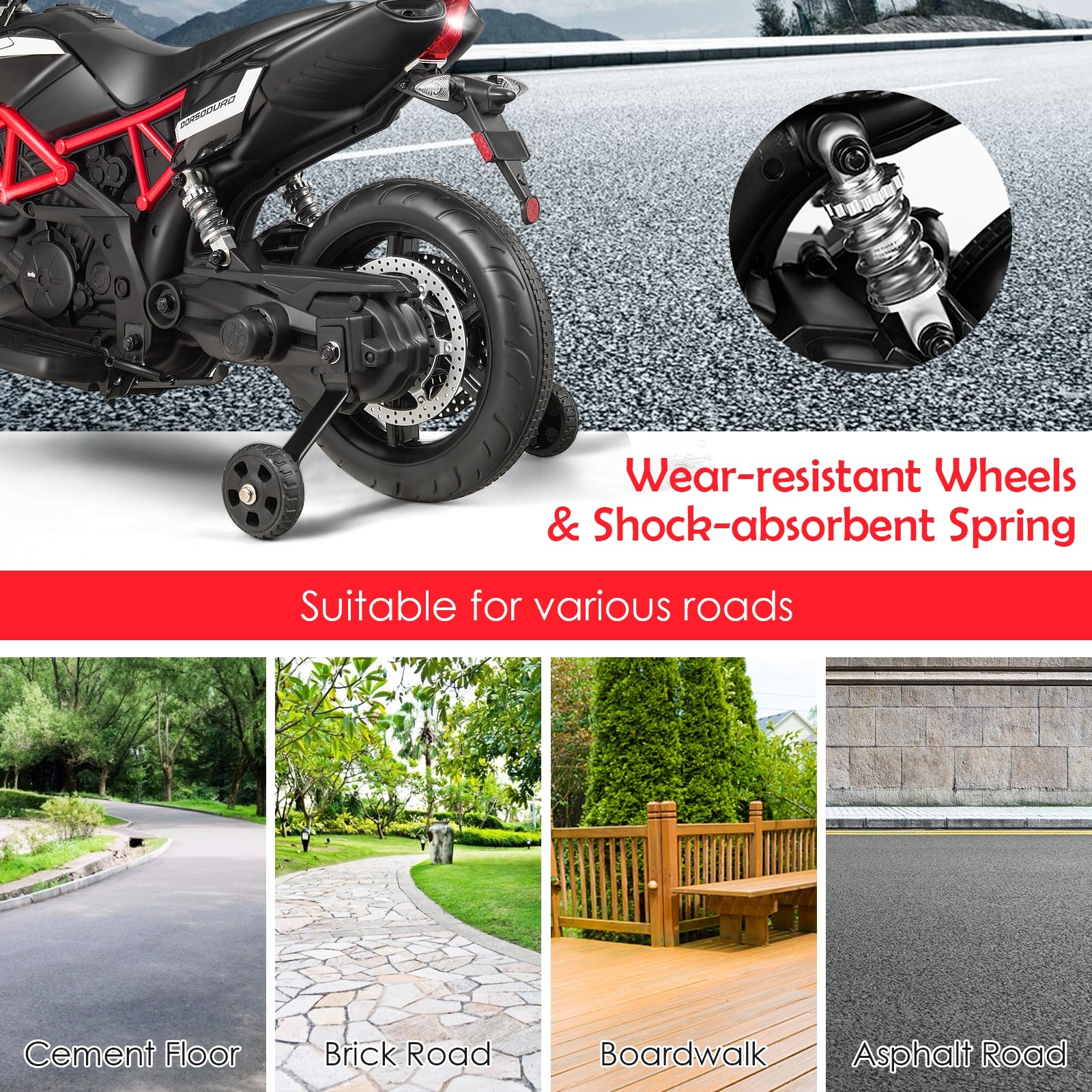 ● Forward and backward function allows kids to drive freely● Equipped with training wheels to let kids drive with great stability● Shock absorb spring is designed to reduce impact and allow for smooth driving● Curved and wide seat for higher comfort● Anti-slip wheels wear-resistant durable suitable for different kinds of ground● A variety of built-in music and stories for increased fun● MP3 line and USB slot help you play more music your kids prefer● Remaining power display reminds you to charge it in time (the number below 9)● Bright headlight and tail-light make more realistic driving experience● Adjustable volume meets different requirements● ASTM certification for higher reliability● Cheerful gift for kids either boys or girls brighten their daily life Installation guide