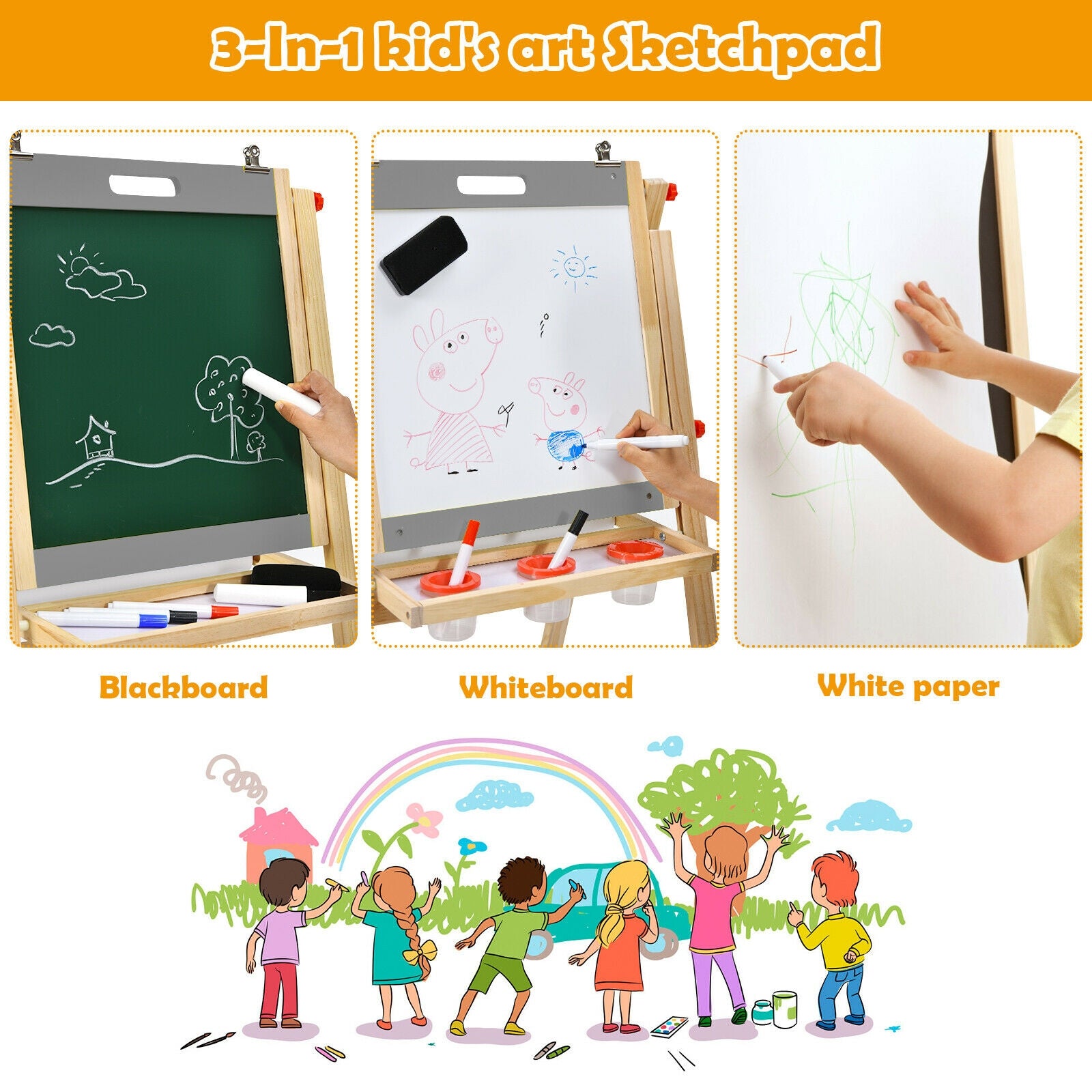 ● 16.5 ft drawing paper whiteboard and chalkboard enable kids to freely enjoy various creative activities ● Bring kids fun and motor skills during the using process ● Solid triangle structure ensures high stability and durability ● Storage tray and 3 no-drop paint cups to help kids to store their art supplies ● 5 gears adjustable heights allow kids over 3 years old to draw or write effortlessly ● Foldable design and lightweight allow users to easily move and store it ● Certificated by ASTM to ensure kids' safety ● Equipped with detailed instructions to help you assemble it at ease