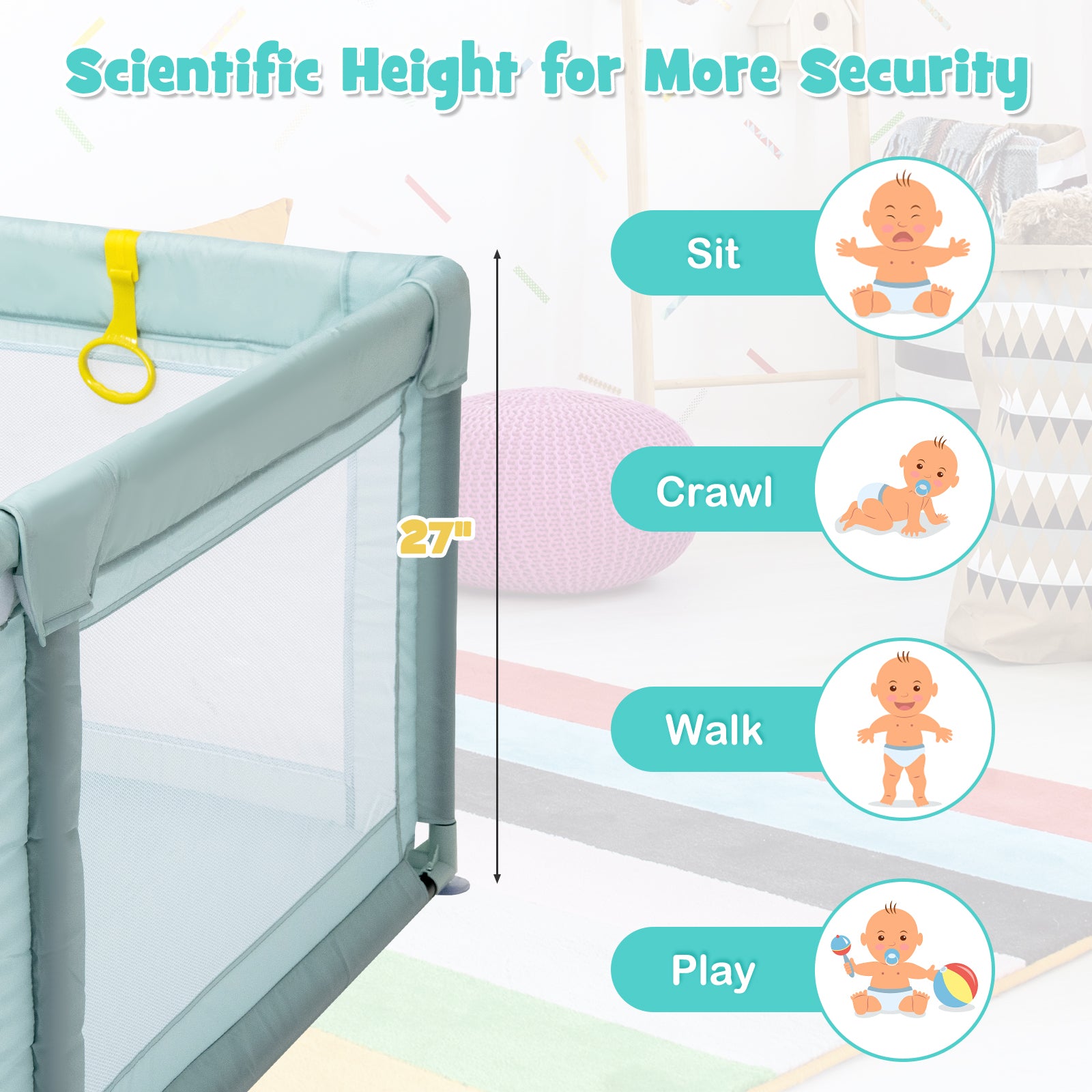● 81" (L) x 73" (W) x 27"(H) play yard for free playing ● 50pcs colorful ocean balls for additional fun ● 4 handlebars help kids to learn how to stand ● High quality and friendly oxford material protect your baby's health ● Visible mesh and zipper door for better protection ● ASTM certification for more security ● Scientific height assist kids to learn to walk ● Outside zipper prevents kids from escaping from the playpen ● Solid steel structure with suction cups for excellent stability ● Able to exercise toddler’s body and promote their hand-feet coordination ● Suitable for living room kid’s room kindergarten etc ● Folding design with lightweight makes it easy to carry and store ● Simple structure and detailed instruction for easy assembly Installation guide