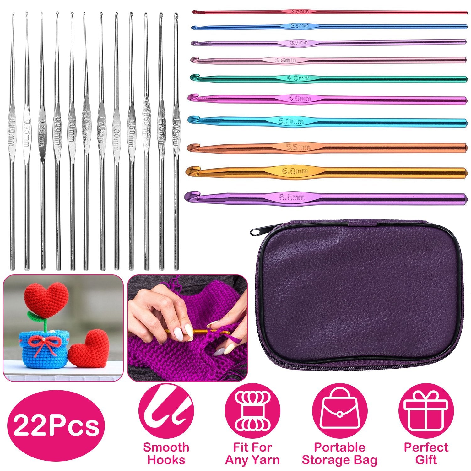22Pcs Multi-Color Crochet Hook Needles Aluminum Handle Sewing Kit DIY Hand Knitting Craft Art Tools Weave Yarn Set 0.6mm-6.5mm w/ Storage Case